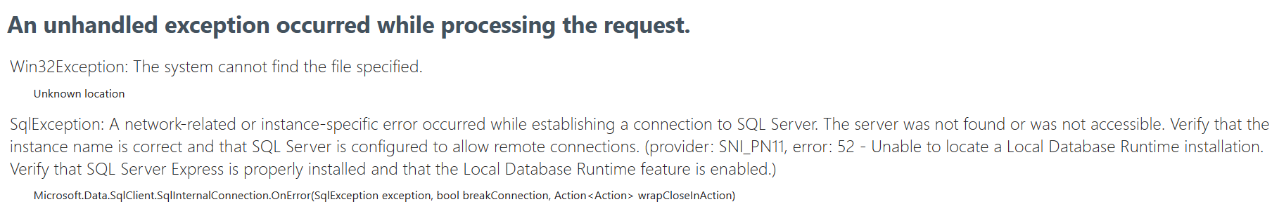 SQL Server와의 연결에 문제가 있다고한다.