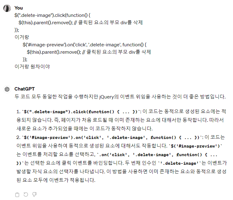 따라서 정적인 요소하고 동적인 요소 둘 다한테 잘 작동하는 $('#image-preview').on('click', '.delete-image', function()) 요 함수를 쓰라는 말인데..ㅎ